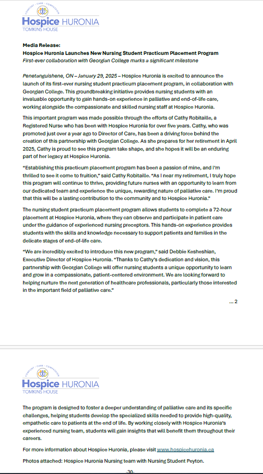 Click here to read the Media Release: Media Release Hospice Huronia Launches Nursing Student Practicum Program.pdf
